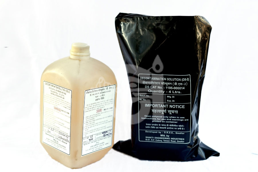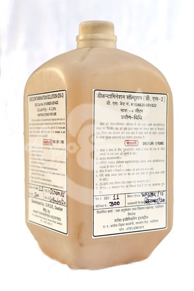 The Decontamination Solution (DS-2) is a mixture of Chemicals and non corrosive to mild steel surfaces. However it is harmful to skin and eyes for which proper care should be taken while handling. It is normally packed in plastic containers and used by spraying and swabbing methods.
