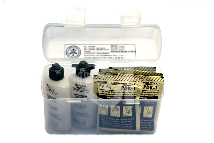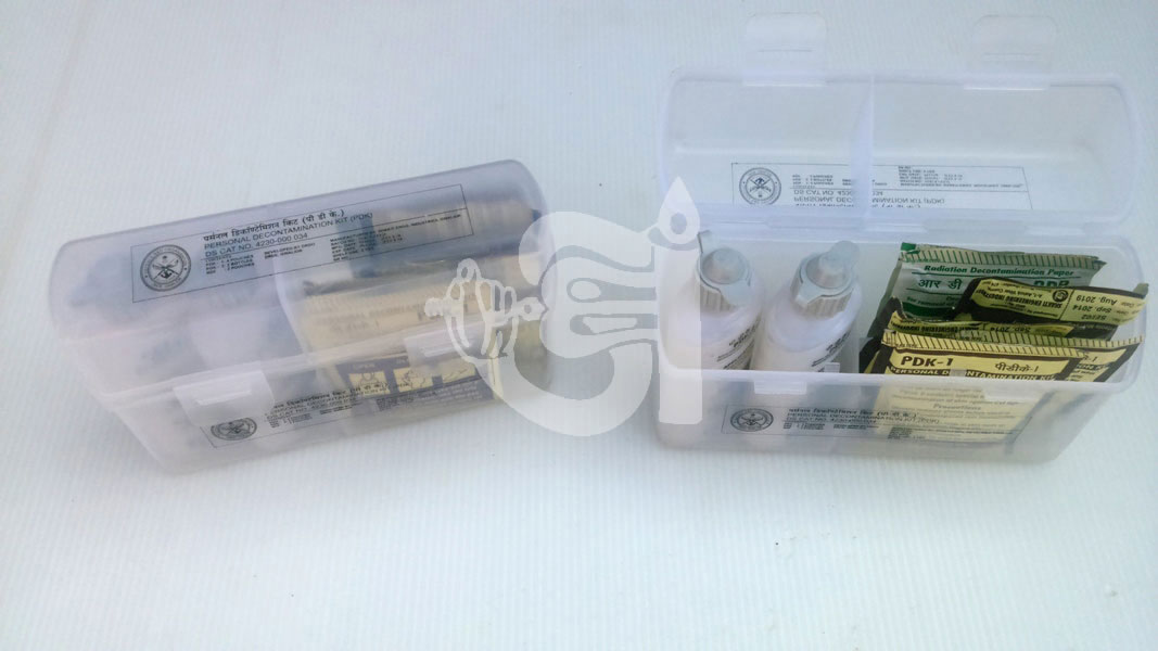 The Personal Decontamination Kit contents of three components, PDK-I, PDK-II and RDP. PDK-I is the containing the absorbent powder and PDK-II the puffer bottle with the same powder while the RDP is a pouch containing tissue paper soaked in a solution. All the three components PDK-I (Four Pouches), PDK-II (Two Bottles) and RDP (Two Pouches) have been packed together in a box under the common nomenclature PDK.